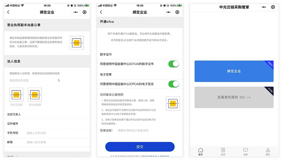 采購管家小程序結(jié)合中國金融認(rèn)證中心(CFCA)電子認(rèn)證服務(wù),在保證安全的情況下,為用戶提供在線刷臉認(rèn)證蓋章服務(wù)。