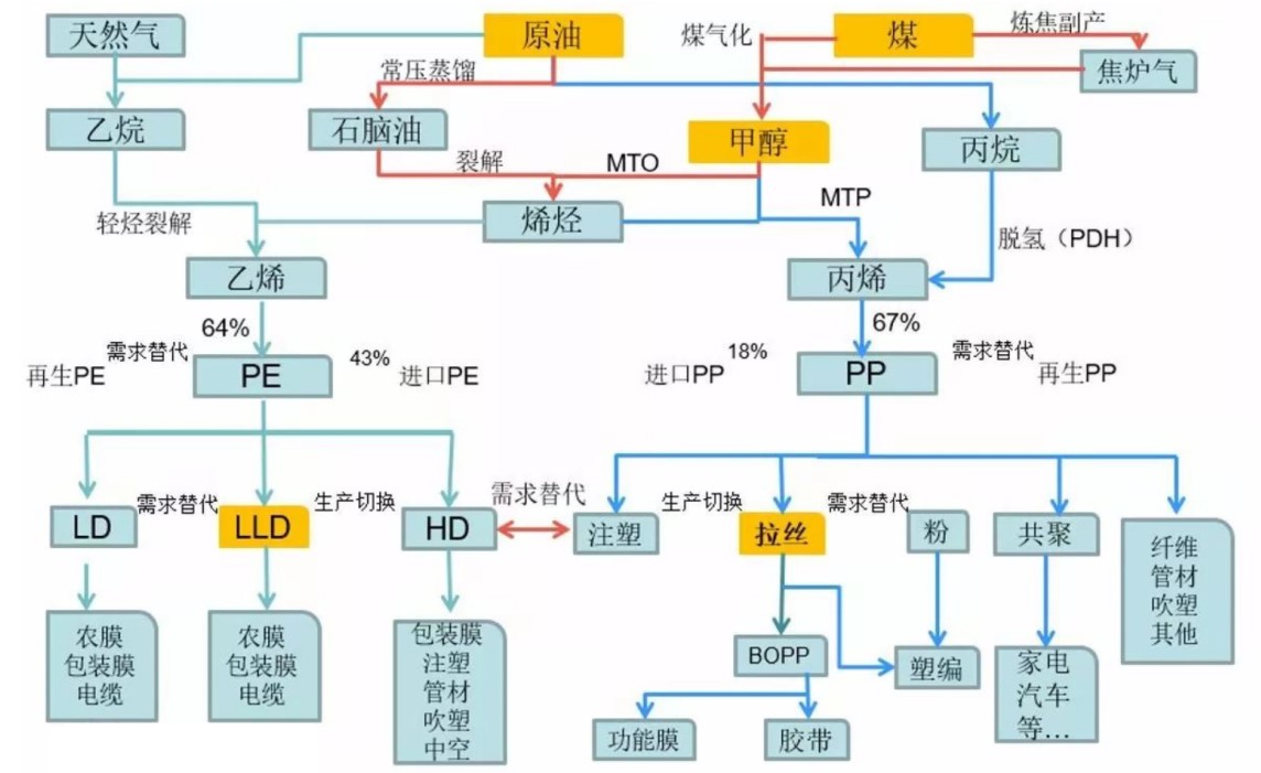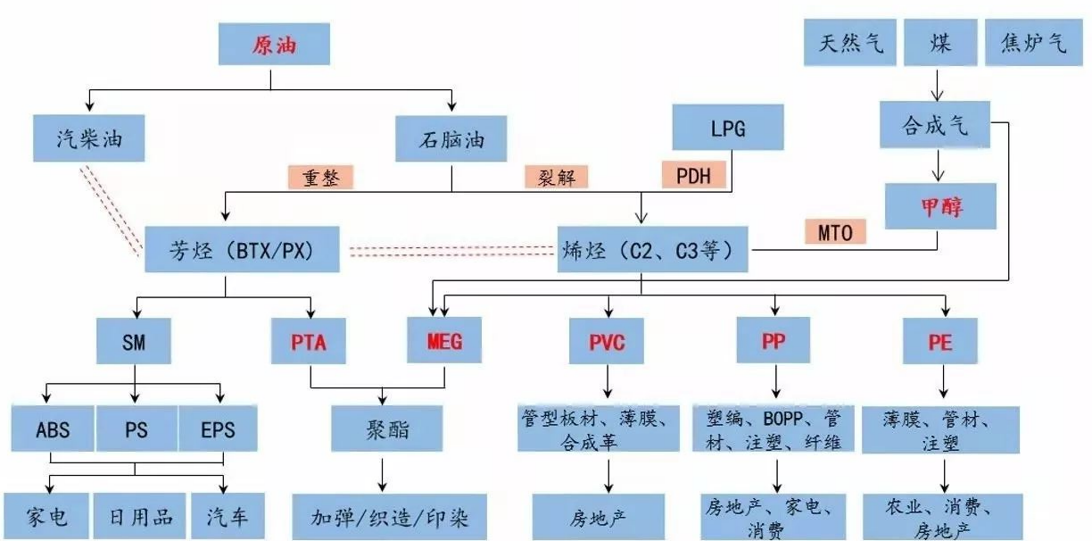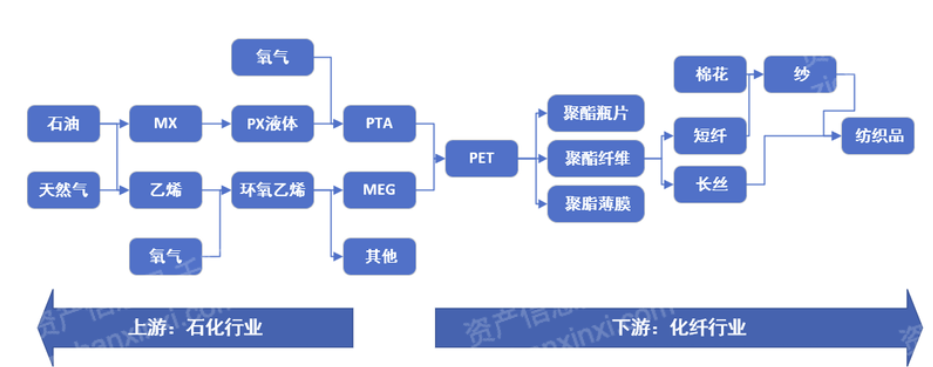PTA下游直接成品是聚酯,可以細(xì)分為短纖、切片、長(zhǎng)絲、瓶片和膜片。短纖和長(zhǎng)絲的下游是布料,是主要的紡織原材料;日常見(jiàn)到的飲料瓶就是以聚酯瓶片為原料。