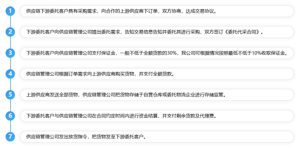 下游委托客戶向供應(yīng)鏈管理公司提出委托需求,告知交易信息告知并委托其進行采購,雙方簽訂《委托代采合同》。